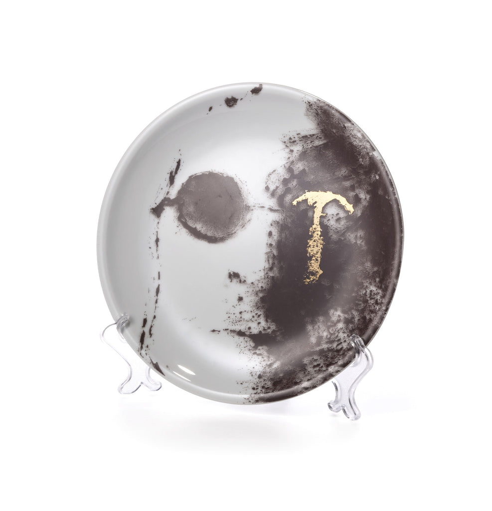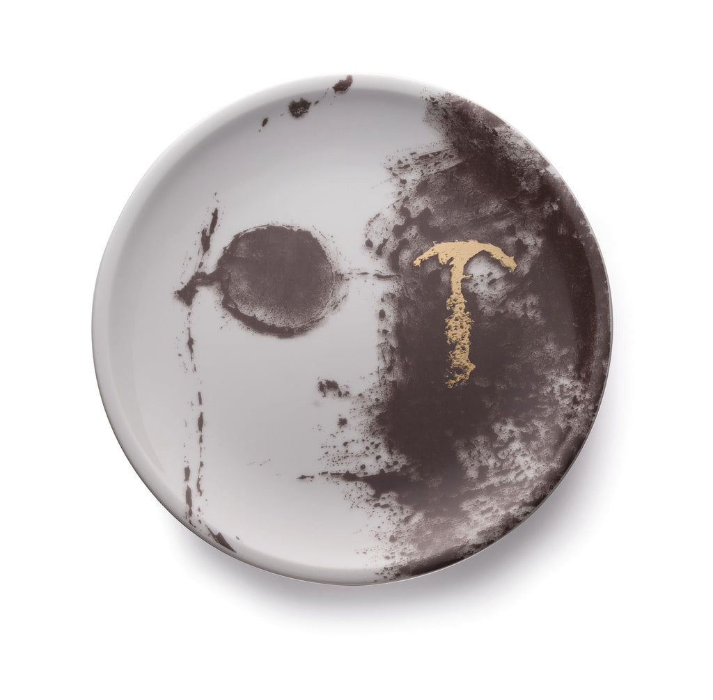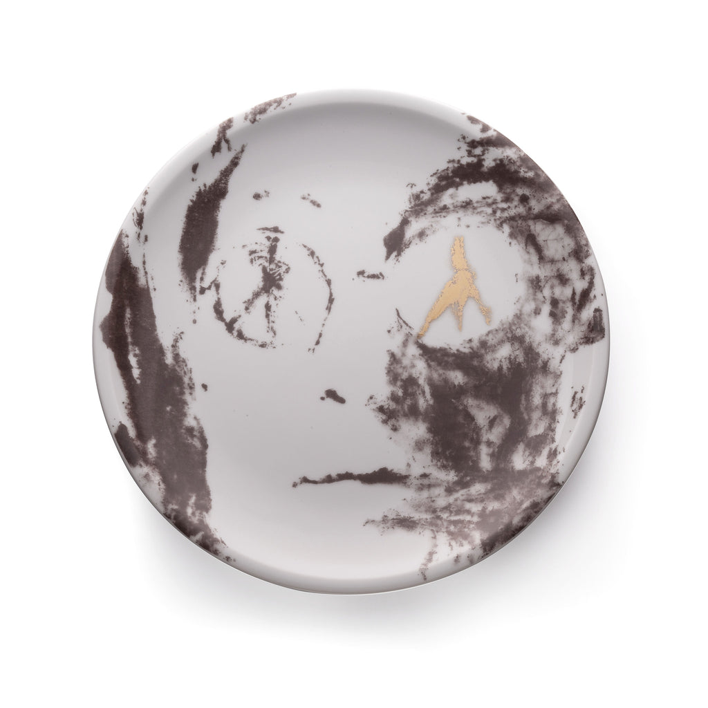 Contemporary dining ware made of German porcelain with an artistic print from the '9 beats of memory' series, combined with 24K pure gold elements for a surprise spark.