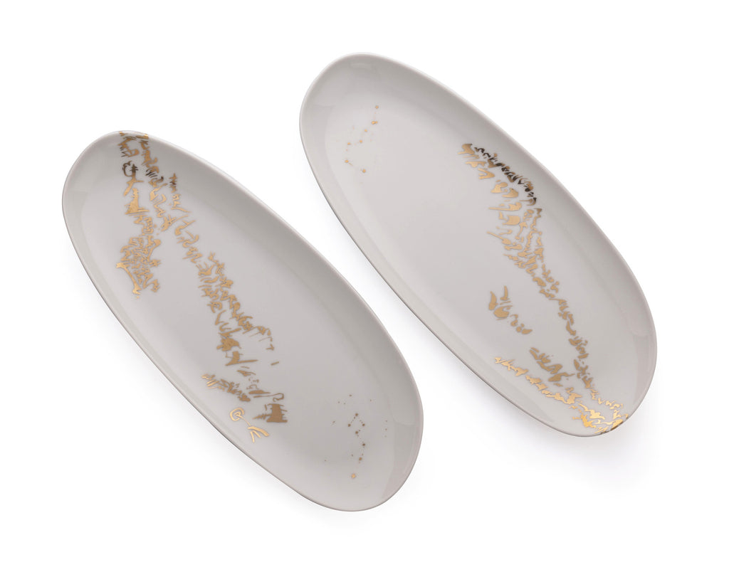 An oval A-symmetric serving dish made of German porcelain with a 24K pure gold Enigmatic Script print.